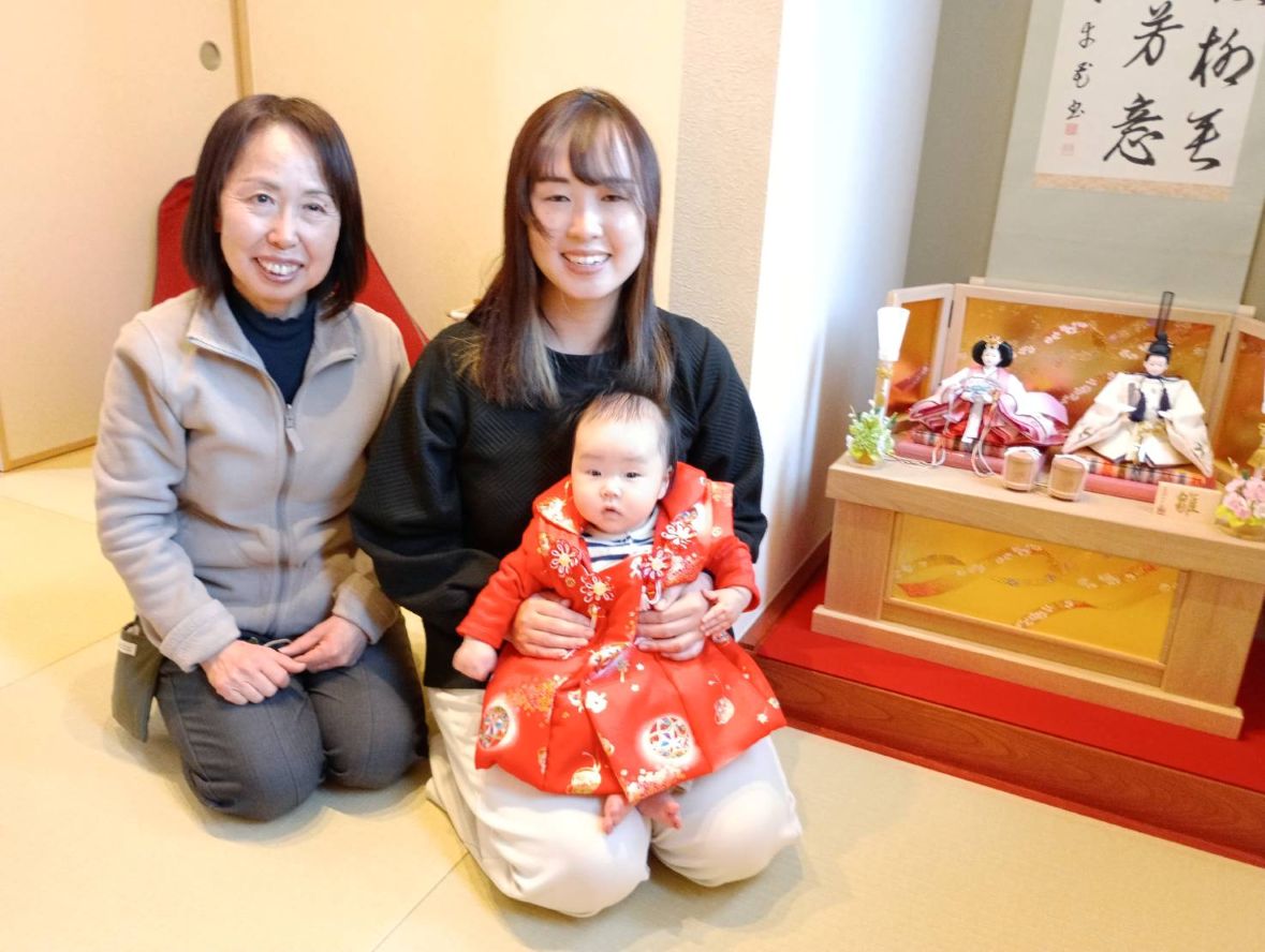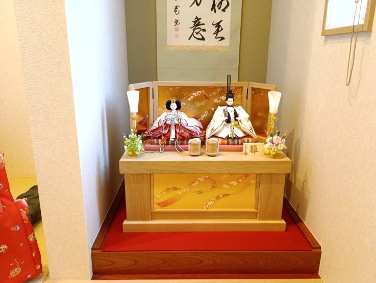 和の空間に 赤ちゃんのママ直筆である書の掛軸と一緒に 凛と飾られました 優しい木肌の収納飾に お好きな親王をお選びいただきお客様オリジナルのおひな様になりました ちなみに 掛軸の書は、『春を喜ぶ漢詩』だそうです 素敵な お節句かざりですね
