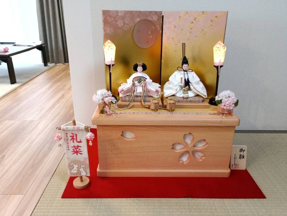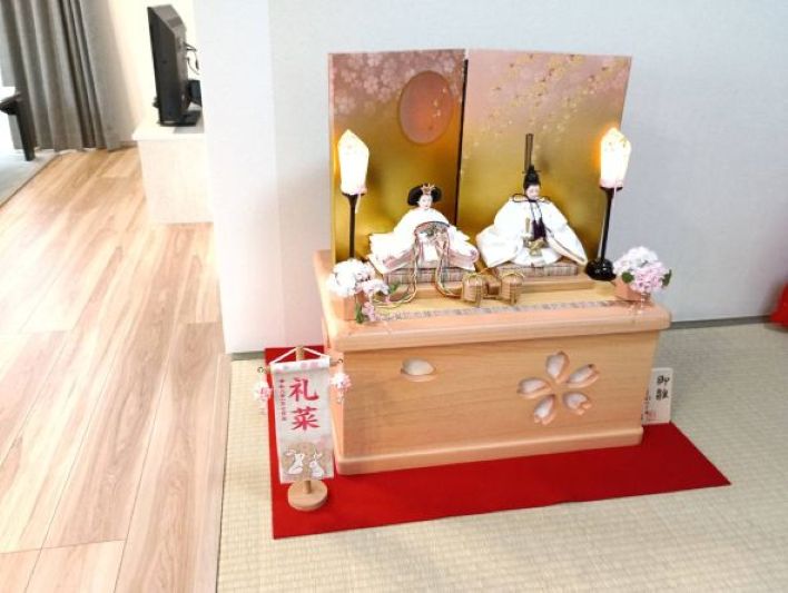 この度も ご愛顧戴いているお客様に引き続きのご縁に感謝申し上げます 桜の彩色をモチーフにした収納飾りに お気に入りのお人形をお選びになり お客様オリジナルのお飾りになりました 新築リビングにて 和の小上がりの間に モダンに飾られました